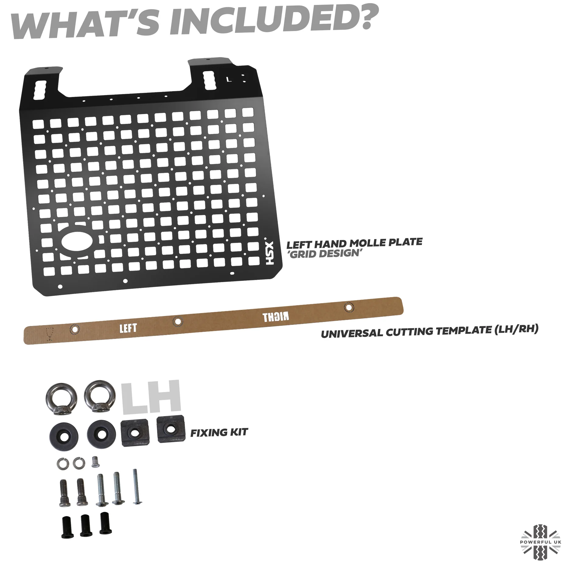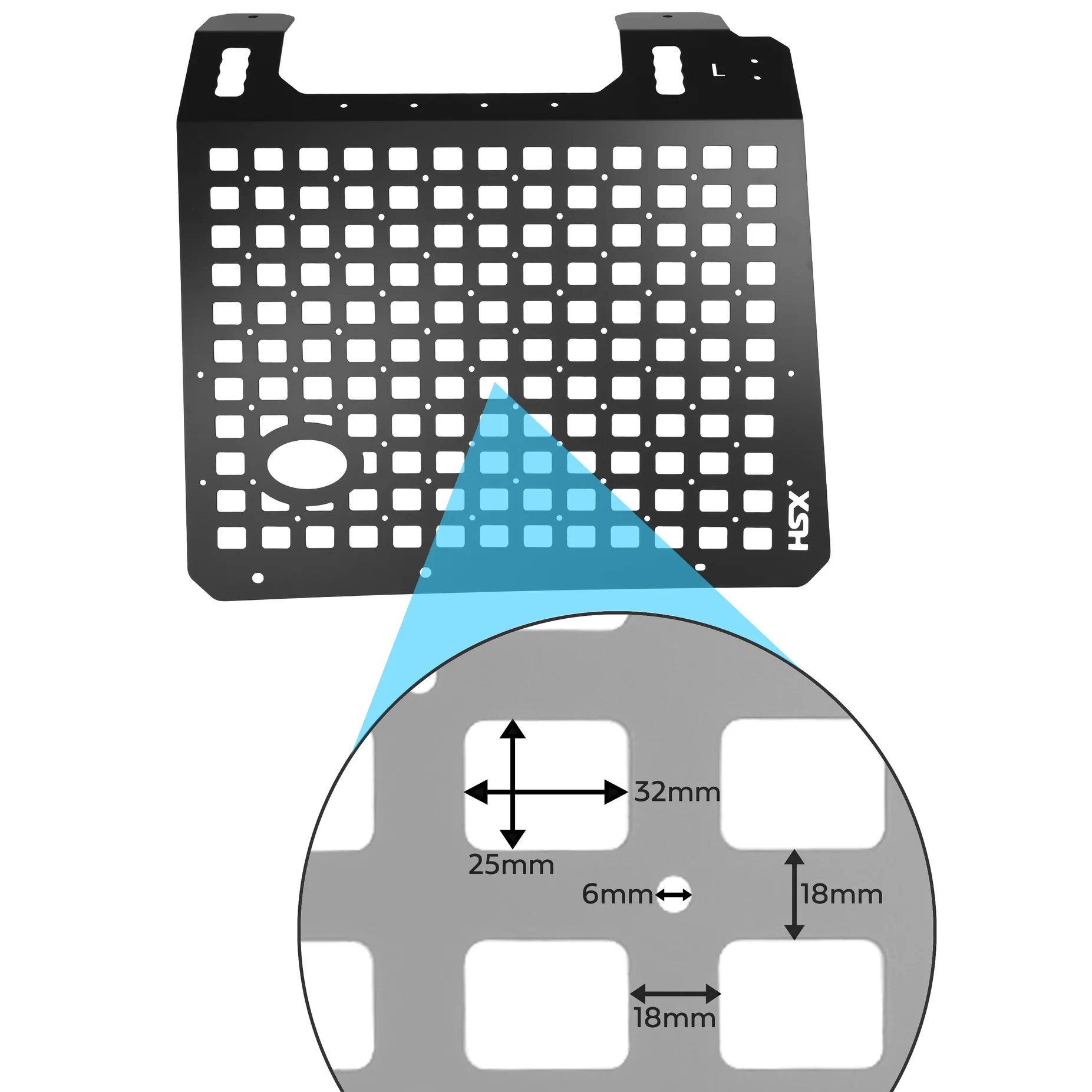 Dit MOLLE grid paneel is ontwikkeld voor de linkerzijde van de Land Rover Defender L663 110. Je creƫert extra montagepunten voor het veilig bevestigen van tools en uitrusting.